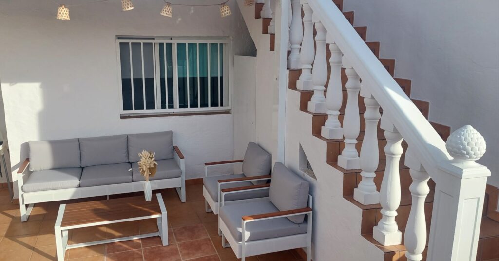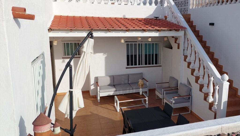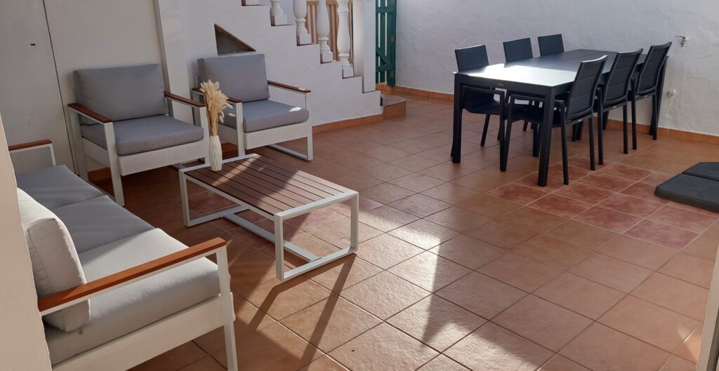 Hier heeft u de gehele dag zon en iedere dag de mooiste zonsondergang over zee. Het terras is voorzien van zonnebedden, eettafel en parasols. Voor de ingang van het appartement vindt u een prachtige knusse patio waar u in alle stilte s’morgens kan genieten van uw ontbijt of waar u gewoon even lekker in schaduw kunt zitten. De patio is eveneens voorzien van een tafel met stoelen, loungebank en loungestoel.